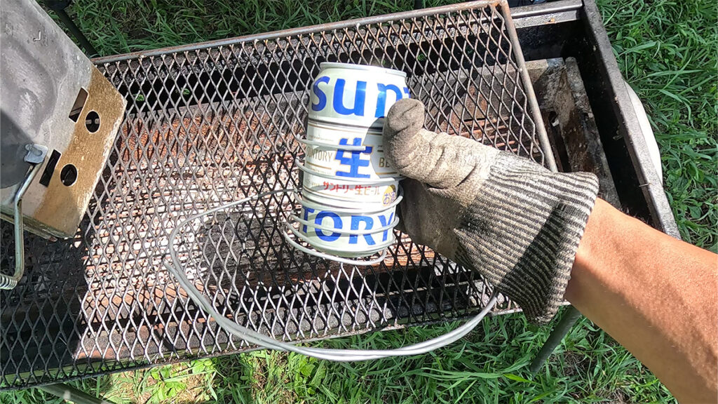 丸鶏が倒れにくくするために、差し込むビール缶を針金でぐるぐる巻きにします。