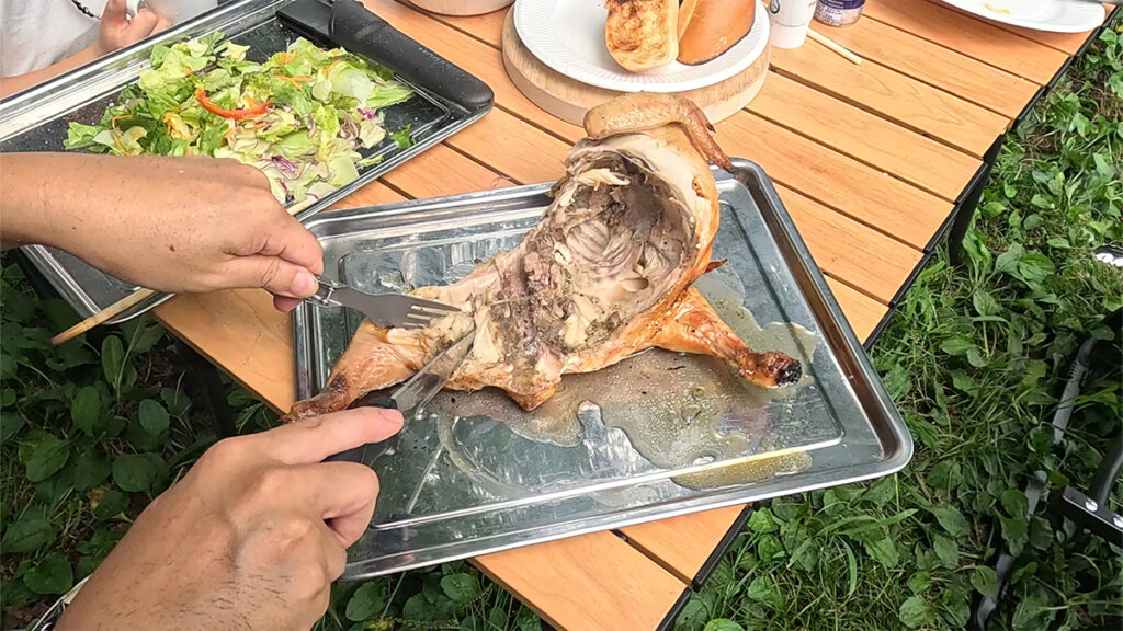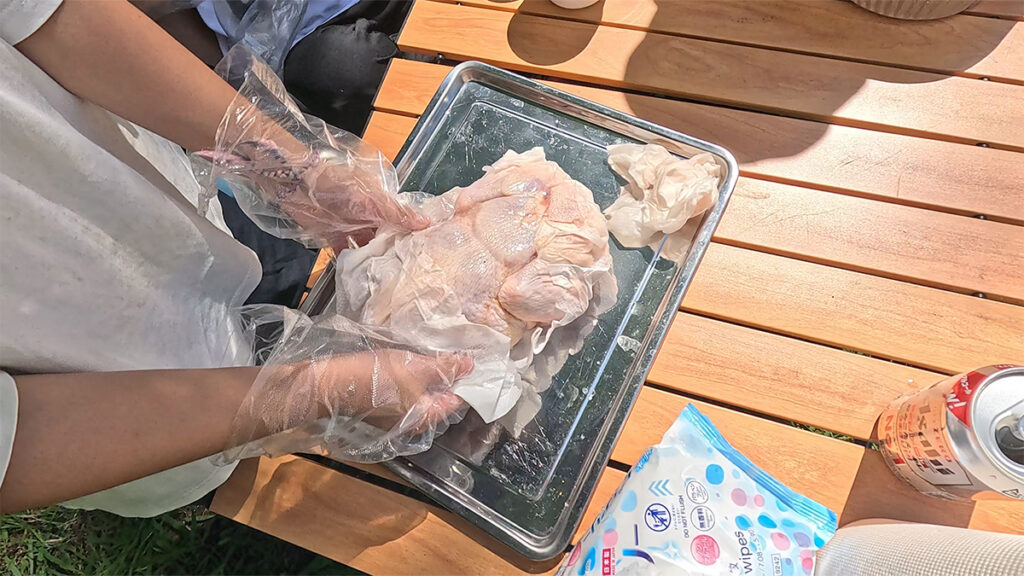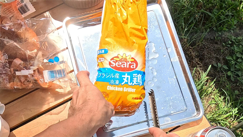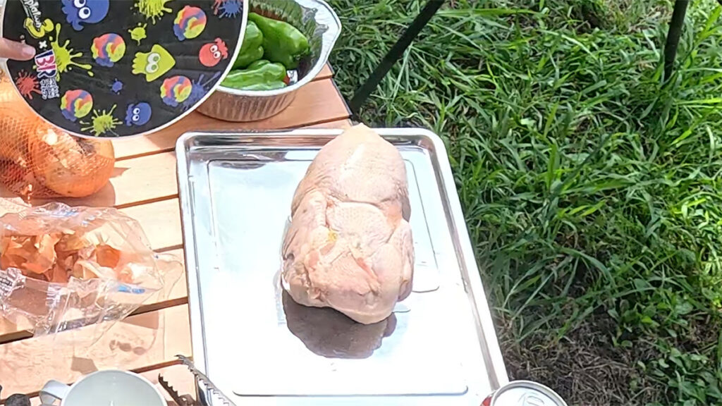 荷物を降ろしたら早速料理に取り掛かります。今回は火を通すのに時間がかかりそうなビア缶チキンを作るので早速始めていきます。