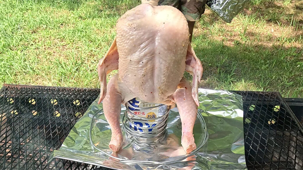 準備ができたら、ビール缶に鶏肉を差し込みます!