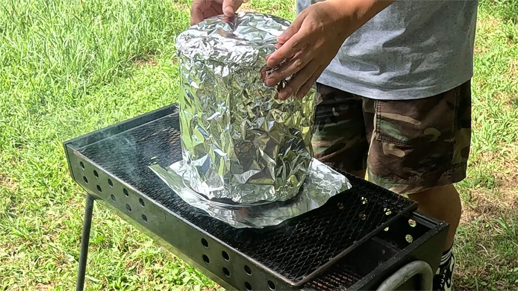 鶏肉が立ったらアルミホイルで作った蓋を上からかぶせて火が通るまで放置!